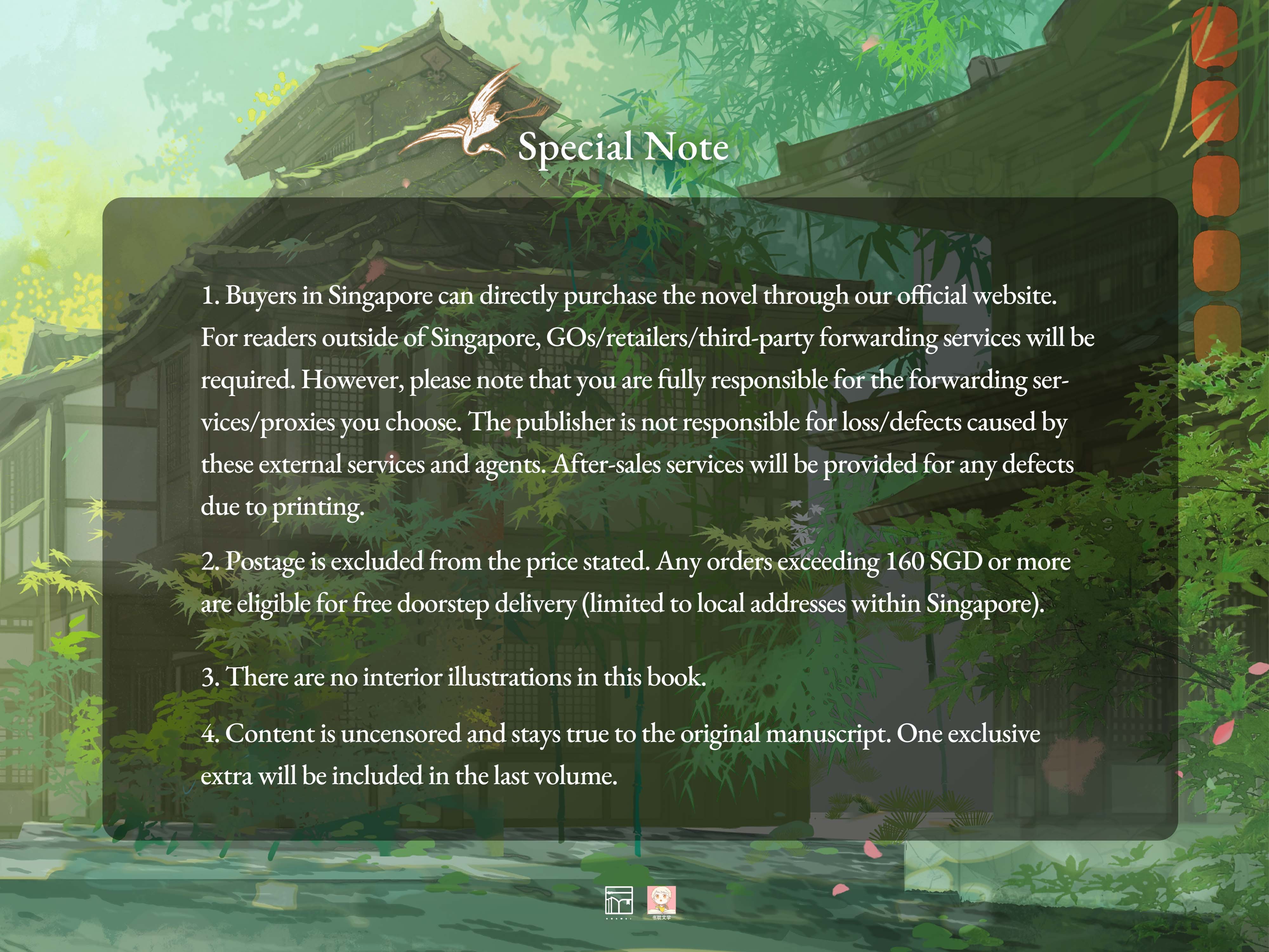1. Buyers in Singapore can directly purchase the novel through our official website. For readers outside of Singapore, GOs/retailers/third-party forwarding services will be required. However, please note that you are fully responsible for the forwarding services/proxies you choose. The publisher is not responsible for loss/defects caused by these external services and agents. After-sales services will be provided for any defects due to printing.